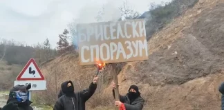 Serbët ia vëjnë flakën “marrëveshjes së Brukselit” në një pankartë në...