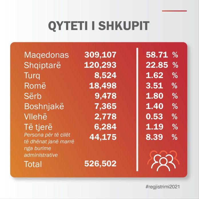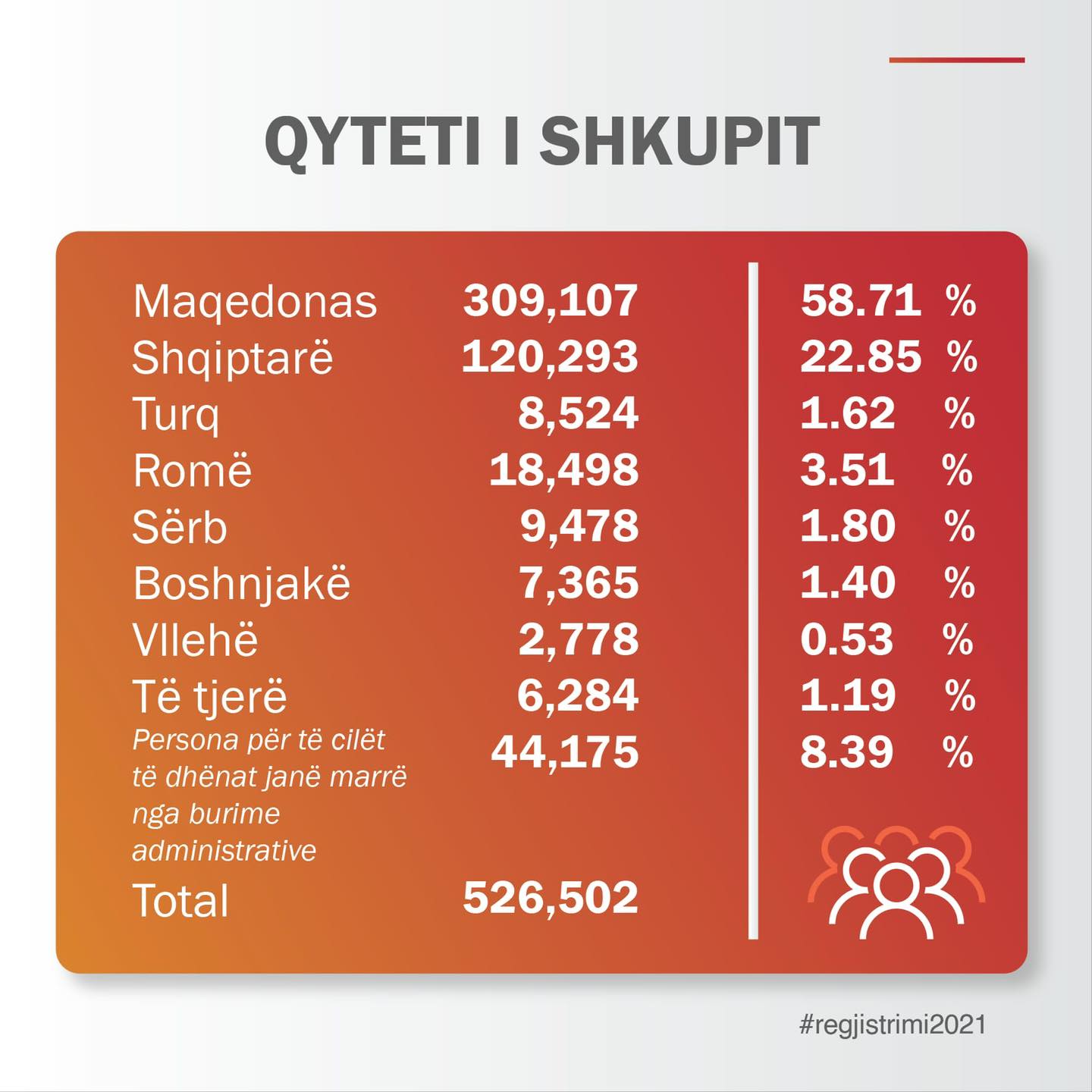 22.85 % shqiptarë në Qytetin e Shkupit March 30, 2022 Share Facebook Twitter Pinterest WhatsApp Linkedin ReddIt Email Print Telegram VK LINE Viber Enti Shtetëror për Statistikë i publikoi rezultatet e regjistrimit 2021 ku në territorin Qytetit të Shkupit shqiptarë janë 22,8 % shqiptarë. Ndërsa në RMV-së janë regjistruar si maqedon 54,21 % ndërsa shqiptarë janë 29,52 % . /KlanMacedonia/ ARTIKUJ TË NGJASHËMMË SHUMË NGA AUTORI Lajme Luma: Nevojitet dokument i përbashkët me “vija të kuqe” për të drejtat e shqiptarëve Lajme Vilma Ruskoska e ka denoncuar në polici Boki-13 për ngacmim Lajme Murtezani: Ministria për Çështje Evropiane pajiset me platformë softuerike për monitorimin e reformave