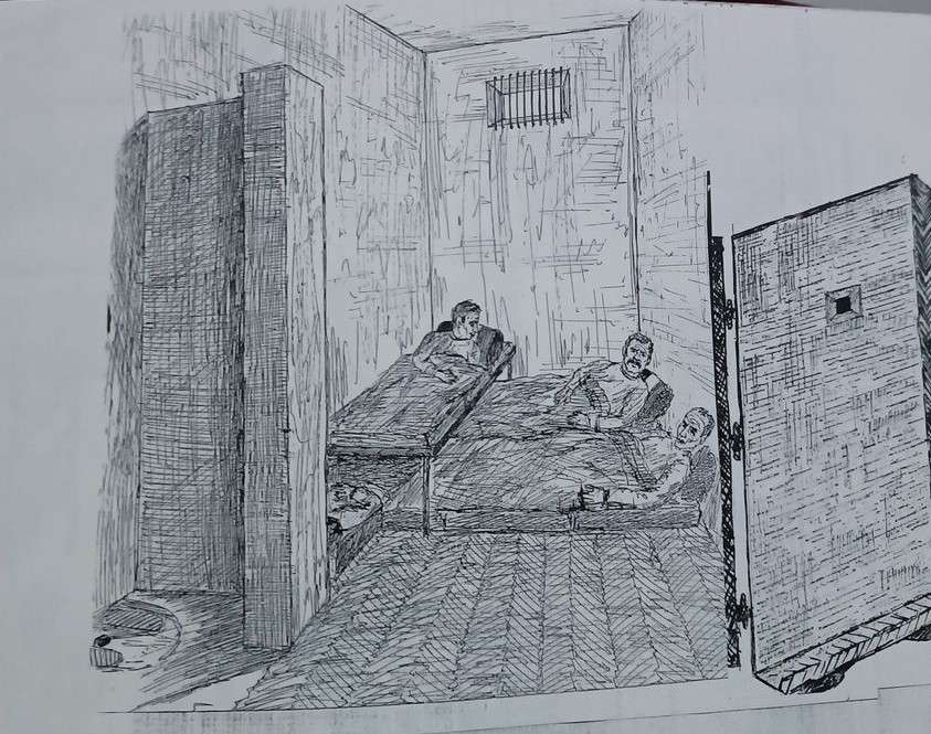 Vizatimin e bëri piktori i njohur z.Rifat Çeliku ku jam unë në qelinë më famëkeqe të burgut të Shutkës Nr.29, në 2 m katrorë i ngujuar me dy kriminelë të rëndë njëri sërb e tjetri malazias. Fatmirësisht kur rash në burg. Zoti më dha fuqi të jashtëzakonshme, edhe pse ata në burgë na futën për t’na i shkatrruar shëndetin dalëngadalë dhe jo me vuajt dënimin, për aferën që ata e sajuan.