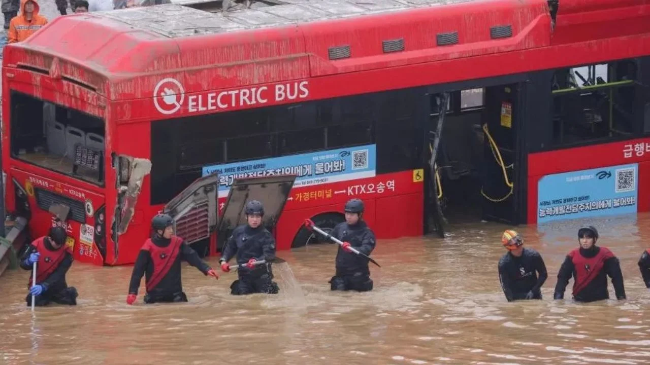 Aktualisht, ekipet e shpëtimit po kërkojnë mes makinave të bllokuara në një tunel të përmbytur në qytetin e Cheongiu.