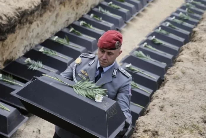 E eshtrat e secilit person u mblodhën nëpër qese të zeza. Autoritetet tani po shpresojnë në identifikim të eshtrave. Kurse grupi planifikon t’i rivarrosë më vonë gjatë vitit në një ceremoni ushtarake në Poloni.