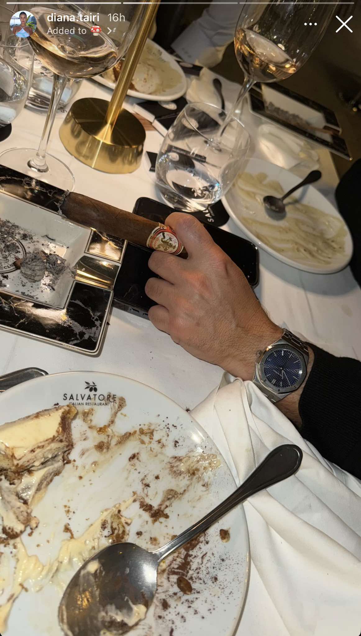 Në imazh shihet bashkëshorti i saj duke shijuar një puro, ndërsa në qendër të fotos qëndron ora e tij luksoze, të cilën Adelina e ka vënë në pah. Postimi duket si një moment i kapur gjatë një daljeje të qetë.