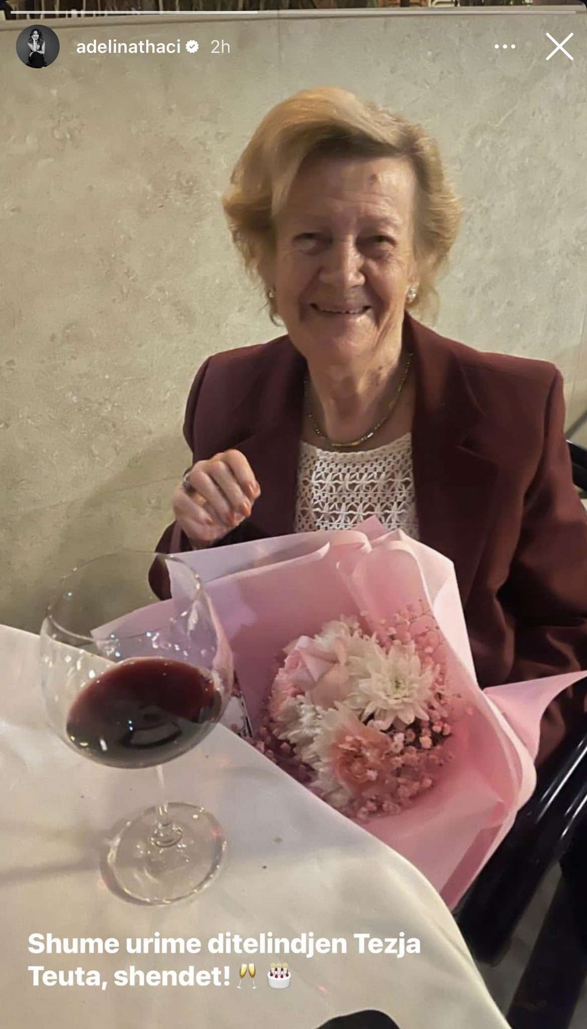 Në një InstaStory, ajo ka publikuar një fotografi të vjehrrës, e cila shihet me një buqetë lulesh në dorë. Krahas fotos, Adelina ka shkruar disa fjalë urimi, duke i dëshiruar shëndet dhe ditëlindje të gëzuar, shkruan “Kosovarja”.