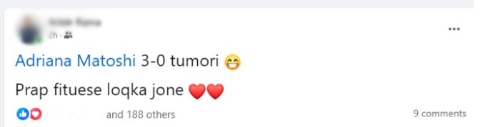 “Adriana Matoshi 3 – 0 tumori. Prapë fituese loçka jonë” ka shkruar në Facebook miku i saj, Arbër Rama.