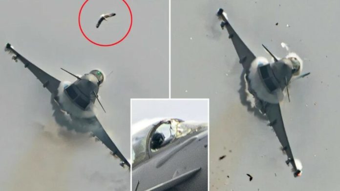 Imazhet treguan zogun duke fluturuar pak përpara aeroplanit që pritej të dhuronte shou. Një foto e dytë tregoi një mjegull copash të kuqe dhe pendësh që rrëshqisnin nga Eurofighter.