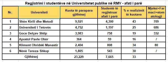 Edhe pse më herët parajmërova se universitetet publike nuk mundet të realizojnë as 50% të kuotave të dhënat nga regjistrimi në afatin e parë në universitetet publike janë shqetësuese të gjitha universitetet publike kanë aritur vetëm 33% të redalizojn regjistrimin e studentëve sipas kuotave.