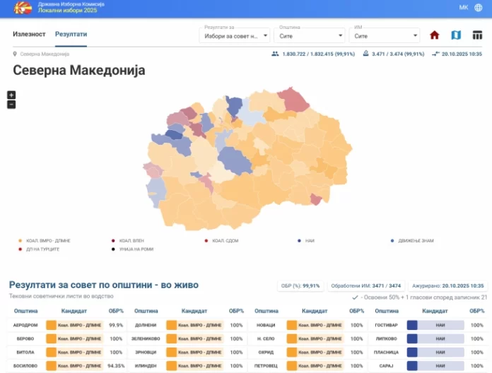 Sipas të dhënave të para jozyrtare nga Komisioni Shtetëror Zgjedhor (KSHZ), partia në pushtet VMOR-DPMNE mori numrin më të madh të këshilltarëve në zgjedhjet e djeshme lokale. Sipas rezultateve të publikuara në ueb faqen e KSHZ-së, janë përpunuar 3.471 nga gjithsej 3.474 vendvotime, që paraqet 99,91 për qind nga numri i përgjithshëm. VMRO-DPMNE mori mbështetje nga 301.919 votuese, ndërsa LSDM-ja opozitare mori 125.824 vota.