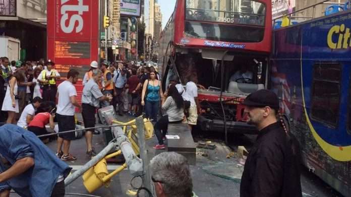 Në një përplasje mes dy autobusëve, njëri prej të cilëve ishte dykatësh, 80 persona u plagosën mbrëmë në New York, njoftuan zyrtarët e shërbimeve të urgjencës.