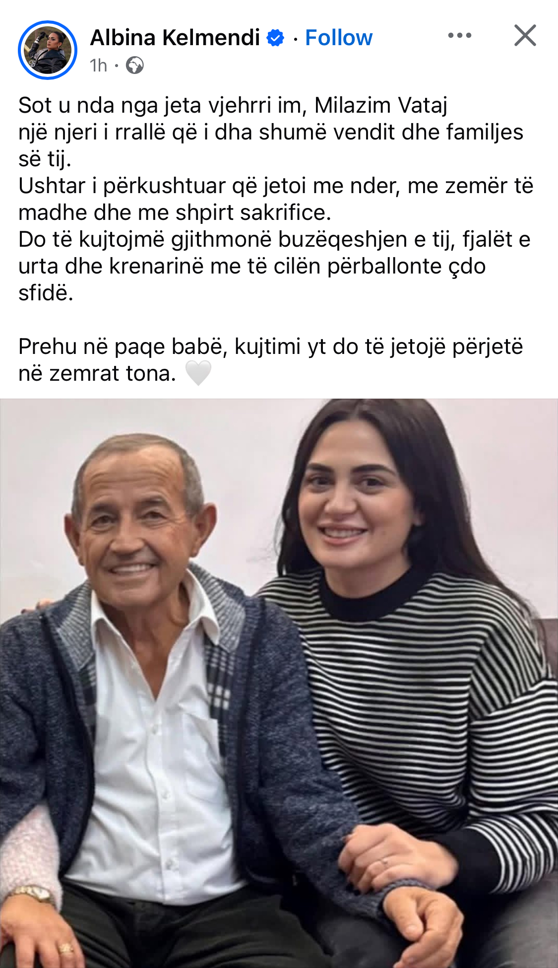 Lajmin e trishtë e ka ndarë vetë Albina përmes një postimi prekës në rrjete sociale, ku ka shprehur dhimbjen dhe respektin e thellë për figurën e tij.
