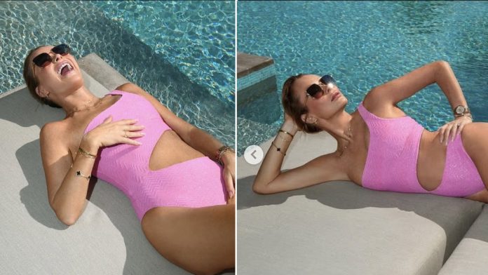 E veshur me një kostum banje nga stilistja Melissa Odabash, prezantuesja britanike tregoi figurën e saj të tonifikuar dhe pamjen elegante, të plotësuar me syze dielli, bizhuteri të thjeshta dhe flokët e kapur topuz.