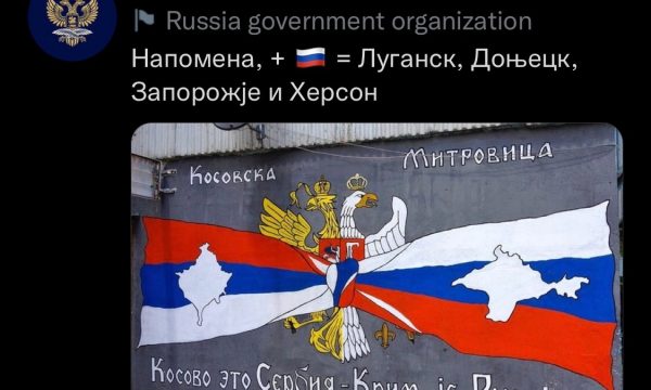 Ambasada Ruse në Maqedoninë e Veriut ka shpërndarë në Twitter të dielën e 6 nëntorit një murale në Mitrovicën e Veriut e cila shkruan “Kosova është Serbi, Krimea është Rusi”.