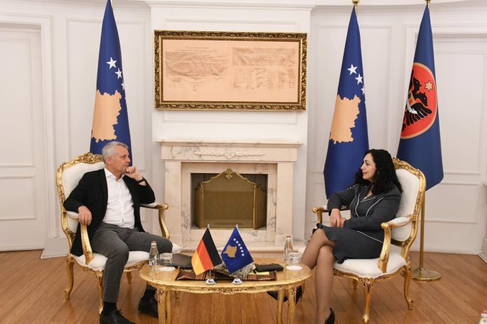 “Pata kënaqësinë që takova sot presidenten e Republikën Kosovës Vjosa Osmani ku diskutuam për zhvillimet aktuale dhe për shtyrjen e zbatimit të vendimeve për targat dhe dokumentet hyrëse-dalëse për datën 1 shtator në koordinim me SHBA-në dhe BE-në. Theksova se vendimet janë legjitime dhe plotësisht në përputhje me marrëveshjet e Brukselit”, ka shkruar ambasadori gjerman.Ndërsa, presidentja Osmani, ka thënë se në takim ambasadorin gjerman ka biseduar për situatën e përgjithshme në vend dhe rajon.
