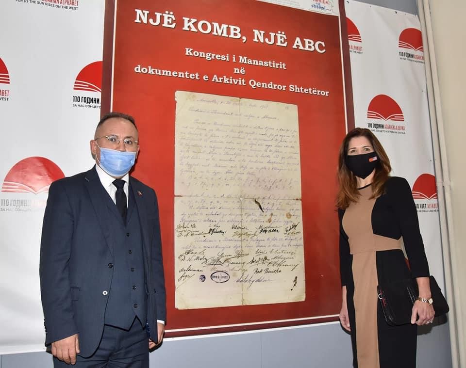 Ambasadorja amerikane në Shkup, znj. Kejt Bërns, ka mbajtur fjalim në ITSHKSH-Shkup me rastin e Ditës së Alfabetit, kurse me drejtorin Skender Asani kanë bë një fotografi të për bashkët para tablos “Një komb, një ABC”.