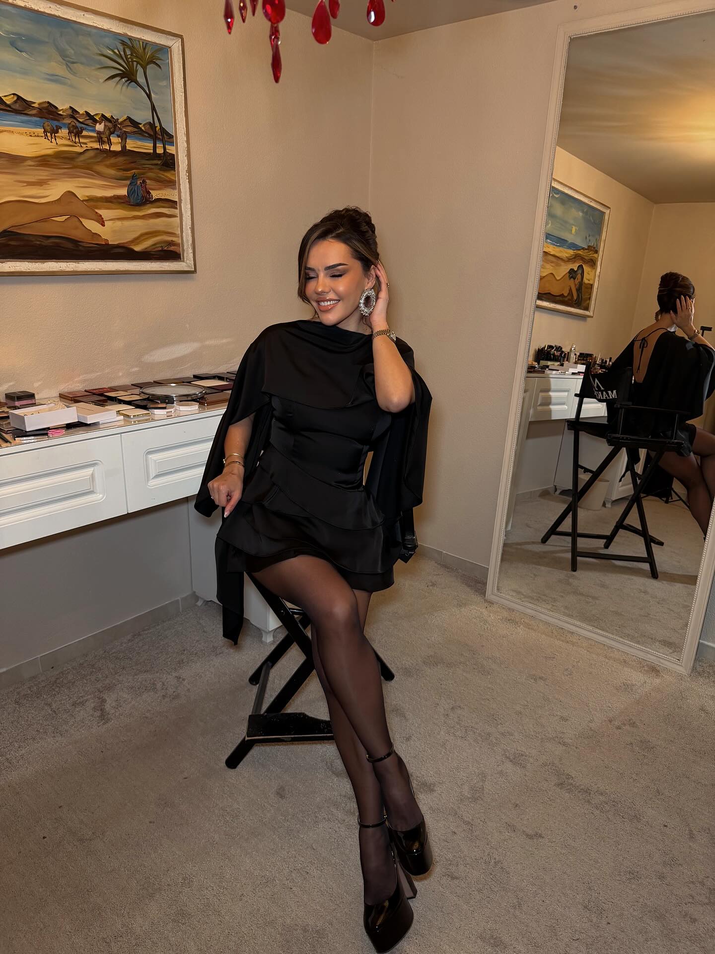 Ajo ka zgjedhur një fustan sateni në ngjyrë të zezë, i cili thekson linjat trupore dhe i jep një pamje klasike.