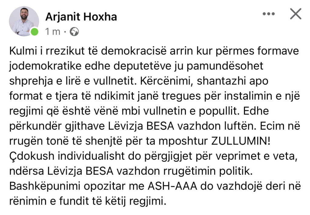 “Kulmi i rrezikut të demokracisë arrin kur përmes formave jodemokratike edhe deputetëve ju pamundësohet shprehja e lirë e vullnetit. Kërcënimi, shantazhi apo format e tjera të ndikimit janë tregues për instalimin e një regjimi që është vënë mbi vullnetin e popullit. Edhe përkundër gjithave Lëvizja BESA vazhdon luftën. Ecim në rrugën tonë të shenjtë për ta mposhtur ZULLUMIN! Çdokush individualisht do përgjigjet për veprimet e veta, ndërsa Lëvizja BESA vazhdon rrugëtimin politik. Bashkëpunimi opozitar me ASH-AAA do vazhdojë deri në rënimin e fundit të këtij regjimi”, shkroi Hoxha në Facebook.