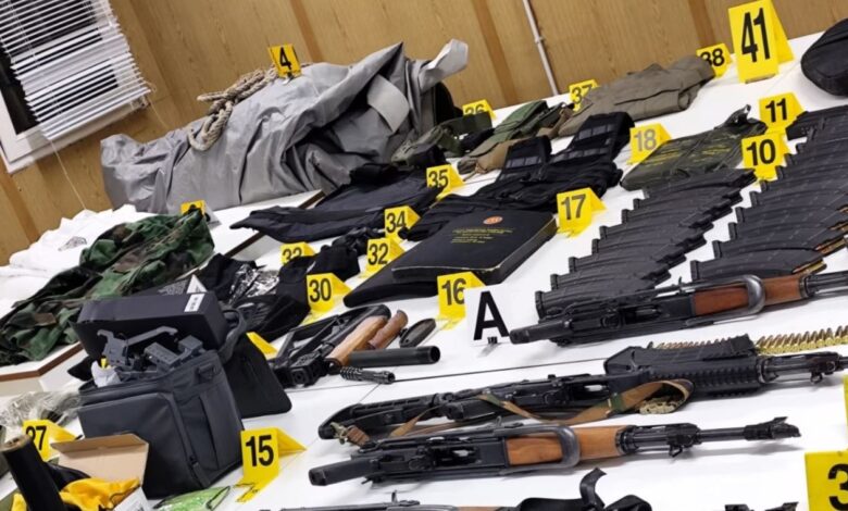 “Njësitet hetimore policore kanë bërë bastisjen në tri lokacione (shtëpi të pa banuara) dhe gjatë kontrollit kanë gjetur dhe sekuestruar 1588 copë municion,10 armë të llojeve të ndryshme, 62 shokë bombë, 1.5 kg. Eksploziv plastik, 1 palë dylbi, 4 radiolidhje, 1 shurdhues, pajisje rezervë për radiolidhje, 33 karikatorë të mbushur, 8 karikatorë të zbrazët, maska, antiplumb, uniforma serbe, uniforma të PK-së, tenda, pajisje për dron si dhe pajisje rezervë të armëve”, thuhet në raportin 24 orësh, transmeton Klankosova.tv.