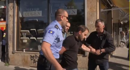 Frashër Krasniqi dhe Zgjim Hyseni nga PSD-ja sapo janë arrestuar nga policia, në protestën e veteranëve të OVL-UÇK-së.
