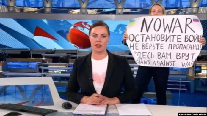 Ovsyannikova më 14 mars u shfaq në transmetim të drejtpërdrejt në një program informues të televizionit rus, Channel One, duke mbajtur në duar një pano ku ndër të tjera shkruhej: “Ndaloni luftën. Mos i besoni propagandës. Ata po ju gënjejnë”. Ajo po ashtu bërtiti: “Ndaloni luftën. Jo luftës”.