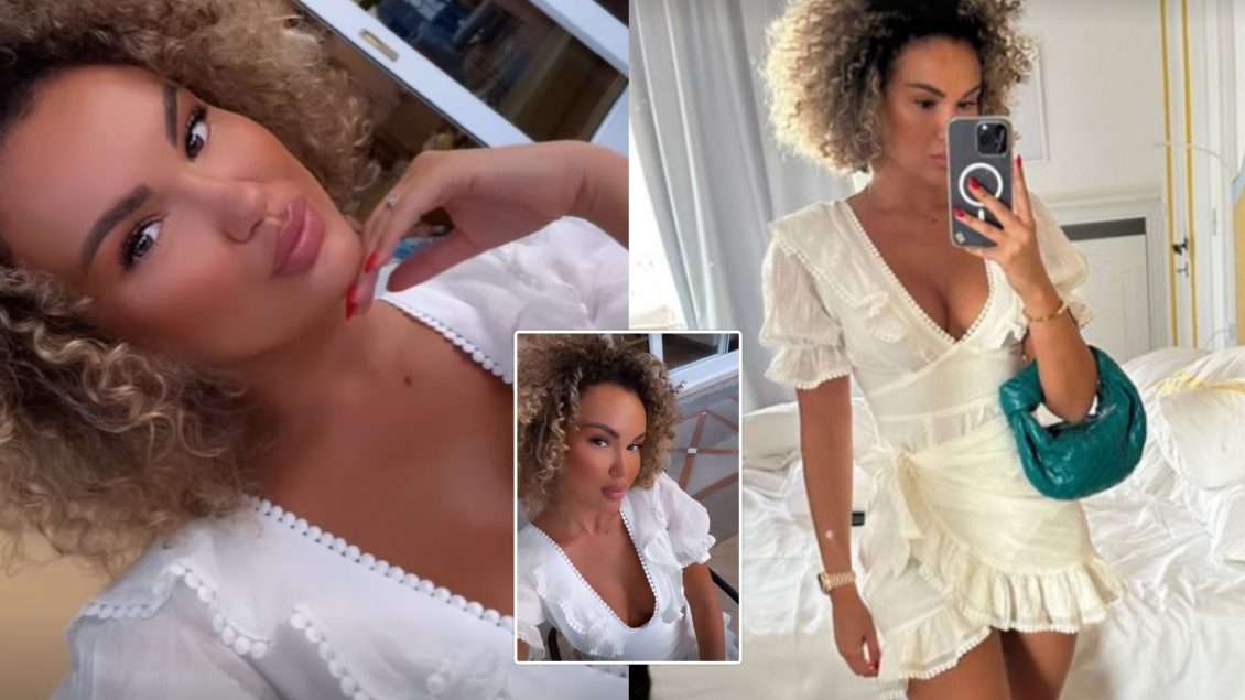 E veshur me një fustan të shkurtër me ngjyrë të bardhë dhe sandale të rrafhsta me ngjyrë të kafët dhe një cantë të gjelbër, ajo dukej tejet provokuese.