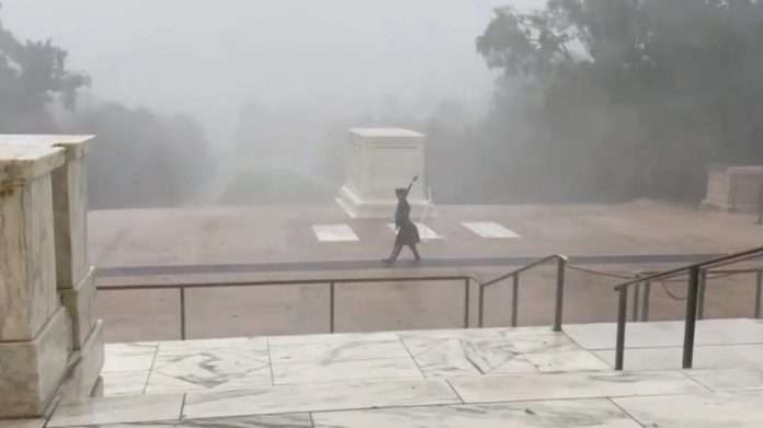Ndërsa erërat e fuqishme goditnin pemët në terrenin e Varrezave Kombëtare të Arlingtonit, një ushtar i vetmuar vazhdoi të ruante varrin e ushtarit të panjohur.