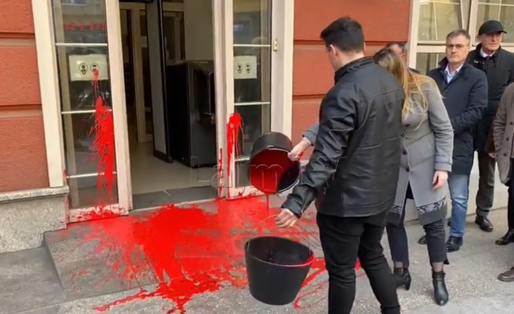 Forumi rinor i Aleancës për Shqiptarët bashkë me deputetët e kësaj partie kanë derdhur ngjyrë të kuqe në hyrje të objektit të Ministrisë së Drejtësisë në Shkup, shkruan gazeta LAJM. “Sot para ministrisë së padrejtësisë hodhëm në mënyrë simbolike gjakun e atyre që e pësuan nga po këta kriminel në mënyrë që tu tregojnë se ata janë të gatshëm të shkelin mbi këtë gjak vetëm për t’i mbrojtur pozitat e tyre”, tha Omer Ajdini nga Aleanca për Shqiptarët. Ajdini kërkoi dorëheqjen e menjëhershme të ministrit Bojan Mariçiq dhe zv.ministrit Agim Nuhiu.