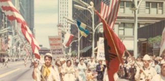 Shqiptarët marshojnë në Çikago në vitin 1960 me veshje kombëtare, me...