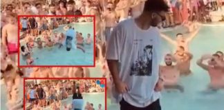 Ledri me akrobacione kërcen me rroba në pishinë gjatë koncertit në...