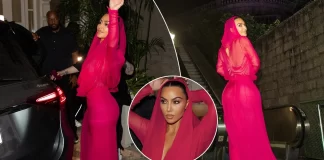 Kim Kardashian shkëlqen në një fustan rozë me mbulesë në paraqitjen...