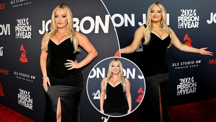 Bebe Rexha shfaqi figurën e saj mahnitëse të trupit e veshur me një fustan të zi, i cili përmbante një bluzë të stiluar si korse prej kadifeje që mbahej lart me rripa të trashë që mbështilleshin rreth shpatullave të saj.