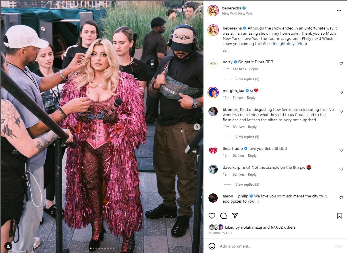 “Edhe pse koncerti përfundoi në një mënyrë të pafat, përsëri ishte një shfaqje e mahnitshme në qytetin tim. Faleminderit shumë New York. Unë ju dua. Turneu duhet të vazhdojë! Filadelfia është në radhë! Në cilin koncert do të vini”, shkroi Bebe Rexha në Instagram.