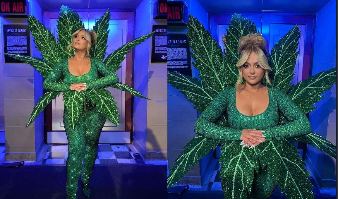 Kjo pasi ajo kishte veshur një kostum të gjelbër me disa gjethe pas shpinës, duke marrë kështu pamjen e një gjetheje kanabisi.