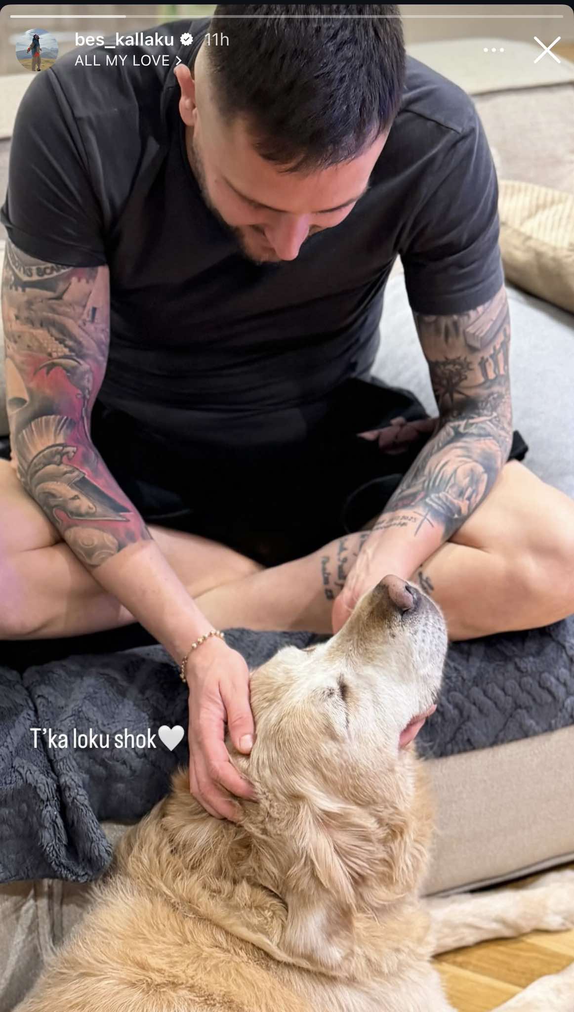 Në mbishkrimin e fotos, Kallaku ka përdorur shprehjen “T’ka loku shok”, duke e shoqëruar imazhin me një ton personal, që reflekton raportin e afërt që ka krijuar me qenin e tij.