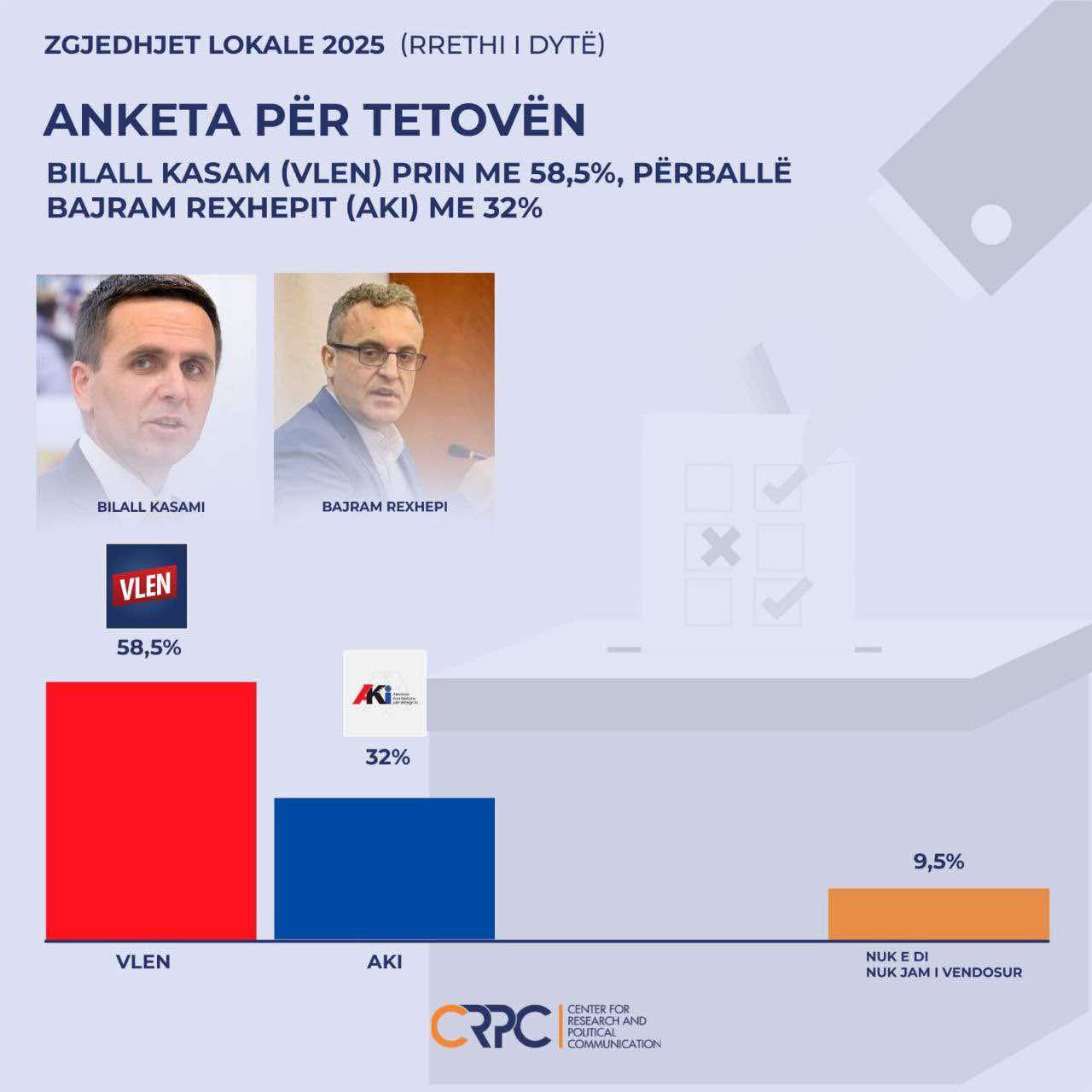Një anketë e realizuar në territorin e Komunës së Tetovës nga data 24 deri më 26 tetor nga Qendra për Humumtime politike dhe Komunikim, tregon një avantazh të qartë të kandidatit për kryetar komune Billall Kasami, ndaj kundërkandidatit të tij nga AKI, Bajram Rexhepi.