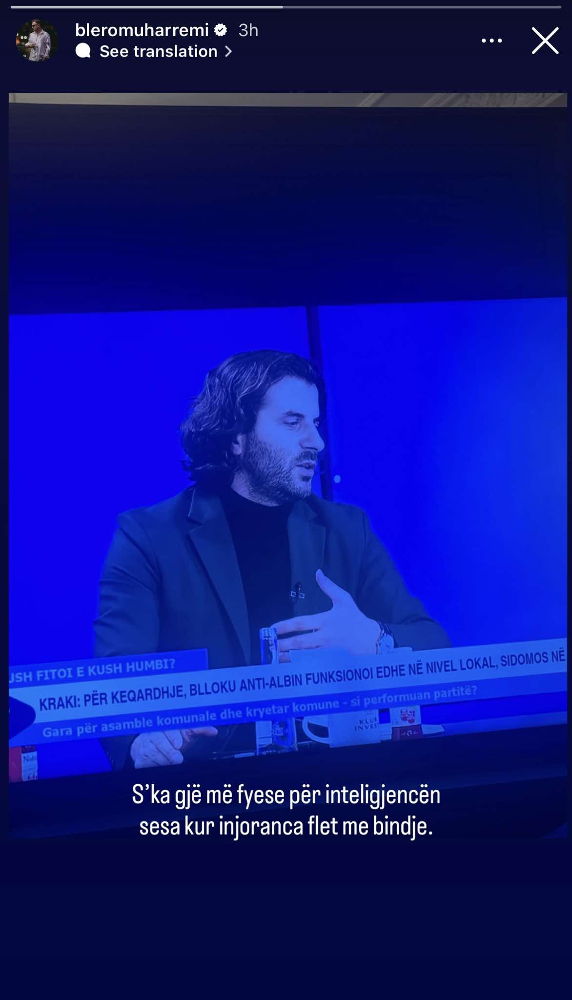 Blero ka publikuar në Instagram një fotografi të Krakit nga një emision televiziv, duke shtuar mbi të reagimin e tij: “S’ka gjë më fyese për inteligjencën sesa kur injoranca flet me bindje”.