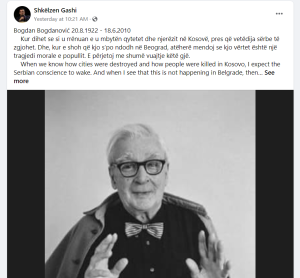 Kur dihet se si u rrënuan e u mbytën qytetet dhe njerëzit në Kosovë, pres që vetëdija sërbe të zgjohet. Dhe, kur e shoh që kjo s’po ndodh në Beograd, atëherë mendoj se kjo vërtet është një tragjedi morale e popullit. E përjetoj me shumë vuajtje këtë gjë.