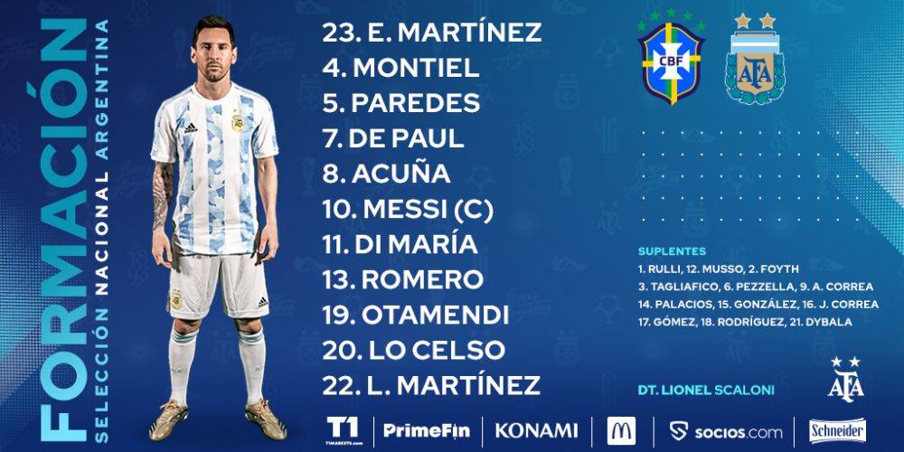 Lionel Messi starton për Argjentinën kundër tani bashkëlojtarit e tij te Paris Saint-Germain, Neymar, i cili i prin sulmit të Brazilit.