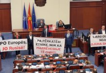 Pasi deputetët e Frontit Europian në shenjë proteste shfaqën afishe gjatë fjalimit të Mickoskit në Kuvend, ku në njërën prej tyre shkruhej “Larg duart...