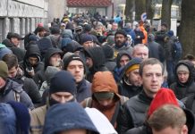 Qindra burra kanë qëndruar në radhë në kryeqytetin ukrainas, Kiev, për t’u regjistruar për t’u bashkuar me forcat e armatosura.