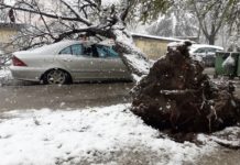 Rreshjet e dendura të borës që kapluan Shkupin gjatë 24 orëve të fundit sot kanë nis të rrëzojnë pemët e vjetra dhe të pa...