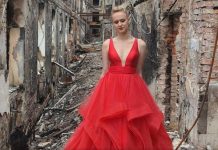 Mes rrënojave të shkollës së saj të shkatërruar nga lufta në Ukrainë, një adoleshente është fotografuar me fustanin që kishte planifikuar të vishte në...