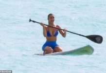 Kim Kardashian tregon mesin e saj të sheshtë me bikini blu dhe pantallona të shkurtra elastike, gjatë seancës së vozitjes me lopatë në ishujt...