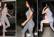 Kim Kardashian thekson linjat e trupit në kostumin e ngushtë, teksa merr pjesë në...