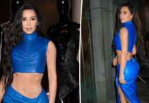 Kim Kardashian merr vëmendje e veshur me kostum të kaltër dhe zinxhirin e diamantit...