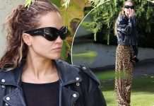 Rita Ora duket elegante me pantallona leopardi dhe xhaketë të zezë, ndërsa fotografohet në...