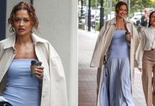 Rita Ora duket e freskët dhe tërheqëse në një fustan të kaltër, ndërsa promovon...