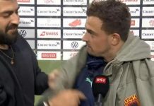 “Episodi i pakëndshëm në fund të ndeshjes në Zvicër: Tifozi hyn në fushatë gjatë intervistave dhe ia vendos Xherdan Shaqirit një xhaketë.