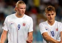 Martin Odegaard foli në një konferencë për shtyp para ndeshjes së Norvegjisë me Spanjën dhe përveç takimin u ndal edhe te bashkëlojtari i tij,...