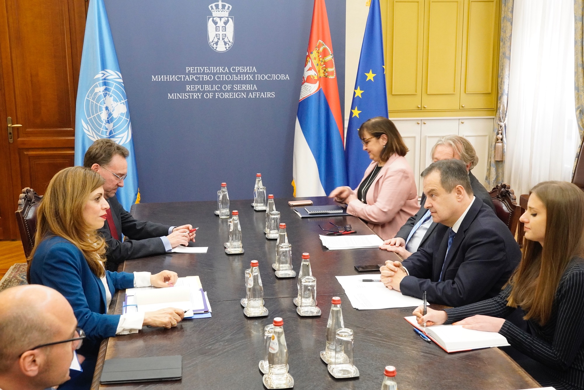 Beograd, 10. aprila 2023 - Prvi potpredsednik Vlade i ministar spoljnih poslova Ivica Daèiæ sastao se sa specijalnom predstavnicom generalnog sekretara UN i šeficom UNMIK Karolinom Zijade. FOTO TANJUG/ VLADIMIR ŠPORÈIÆ/bs