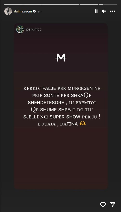 “Kërkoj falje për mungesën në Pejë sonte për shkaqe shëndetësore, ju premtoj që shumë shpejt do t’ju sjelli një super show për ju! E juaja, Dafina”, shkruhet në të./Lajmi.net/