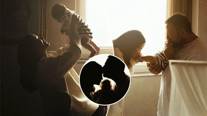 Fotografia e parë është një siluetë prekëse që flet më shumë se fjalët – Kreshniku puth Dafinën në ballë ndërsa ata të dy mbajnë në krahë vogëlushin Daskani. Një moment që simbolizon dashurinë dhe përkushtimin, jo vetëm ndaj njëri-tjetrit, por edhe ndaj jetës së re që kanë krijuar së bashku.